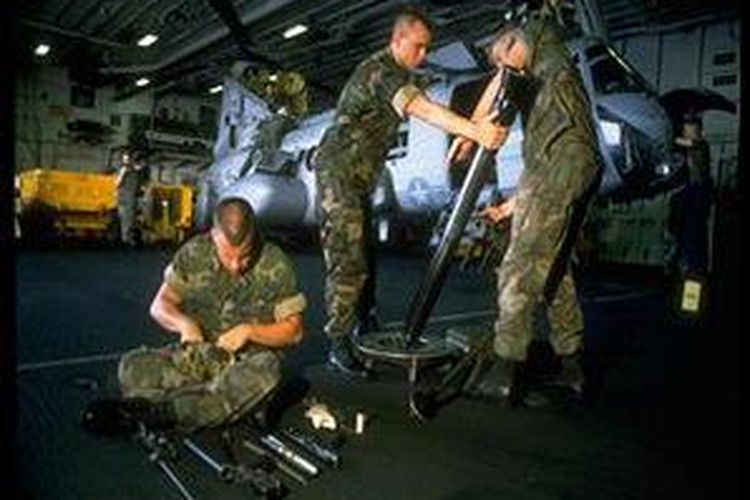 Anggota 24th Marine Expeditionary Unit membersihkan mortar dari atas hanggar USS Inchon sebelum melancarkan invasi ke Haiti.((Getty Images/Time Life Pictures/William F. Campbell))