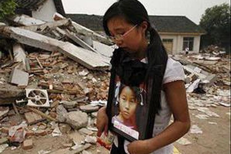 Seorang ibu mendekap foto anaknya yang hilang.