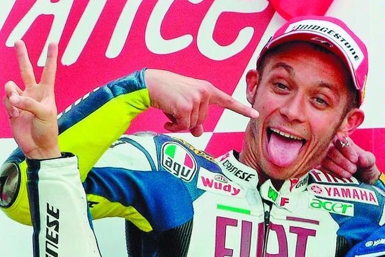Pembalap Yamaha asal Italia, Valentino Rossi, tertawa gembira di podium setelah memenangi GP Perancis, Minggu (18/5) di Le Mans, Perancis. (AP Photo/Michel Spingler)