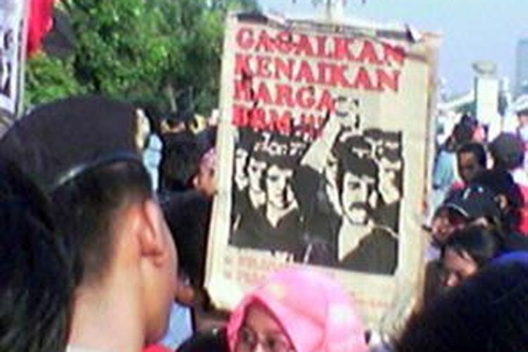 Ribuan demonstran buruh, dan kaum miskin kota yang tergabung dalam Front Pembebasan Nasional, Kamis (29/5) sore, berunjuk rasa di depan Istana Merdeka. Mereka menolak kenaikan harga bahan bakar minyak. Tampak salah seorang demonstran membawa slogan ajakan kepada publik. (KOMPAS/WINDORO ADI)