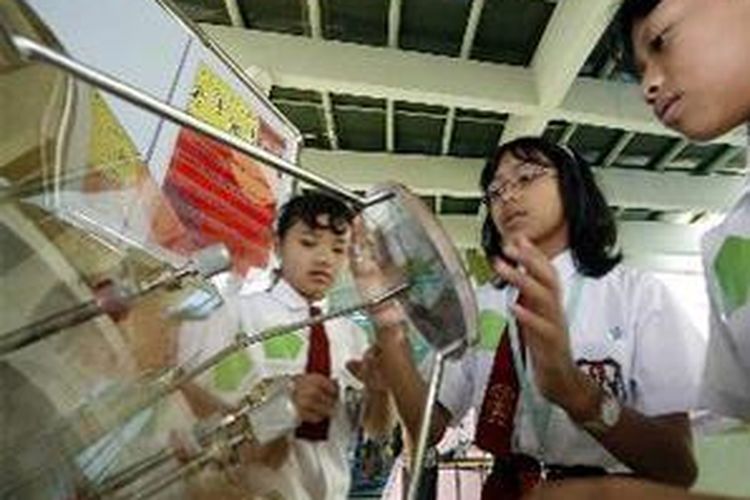 Para pelajar gembira bisa mencoba berbagai alat peraga di Pusat Peragaan Iptek, Taman Mini Indonesia Indah, Jakarta Timur.(KOMPAS/LASTI KURNIA)
