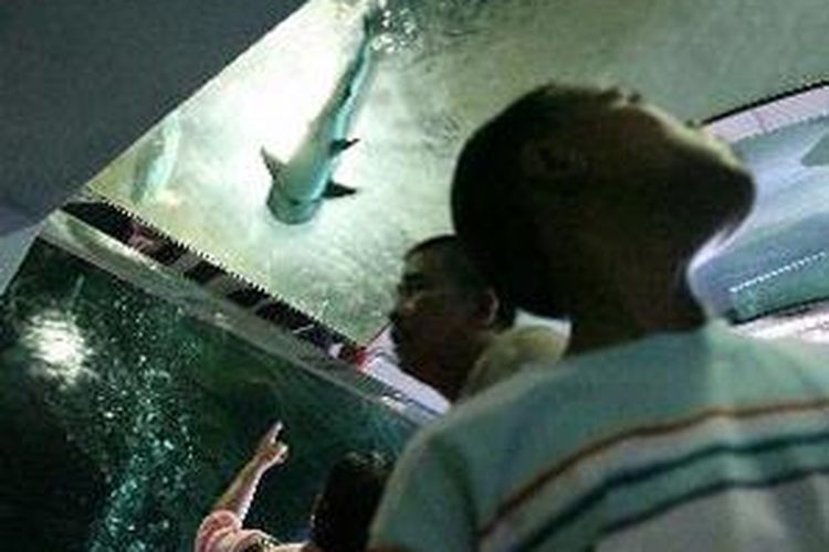 Sejumlah pengunjung memerhatikan ikan-ikan air tawar koleksi Taman Akuarium Air Tawar yang terdapat di Taman Mini Indonesia Indah (TMII), Jakarta Timur.