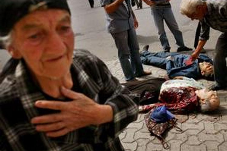 Seorang perempuan tua mengelus dada di dekat jenazah seorang wartawan Belanda dan sopirnya yang terkena mortir tentara Rusia di Gori, Georgia, Selasa (12/8).