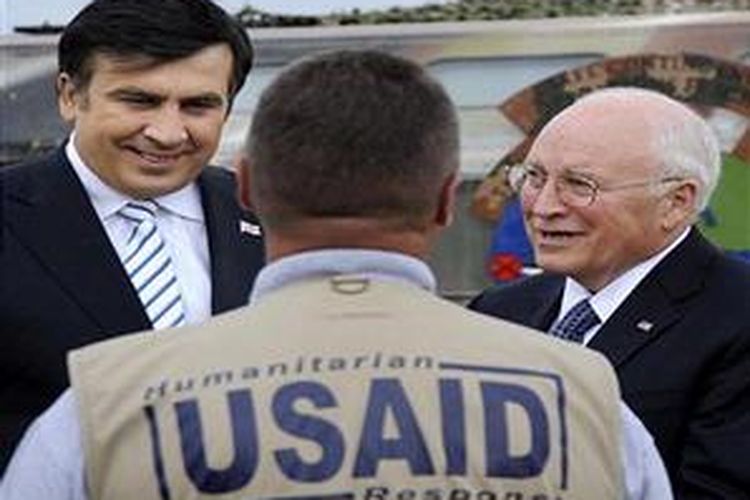 Wapres AS Dick Cheney (kanan) dan Presiden Georgia Mikheil Saakashvili (kiri) bicara dengan petugas USAID di Tbilisi, 4 September 2008.