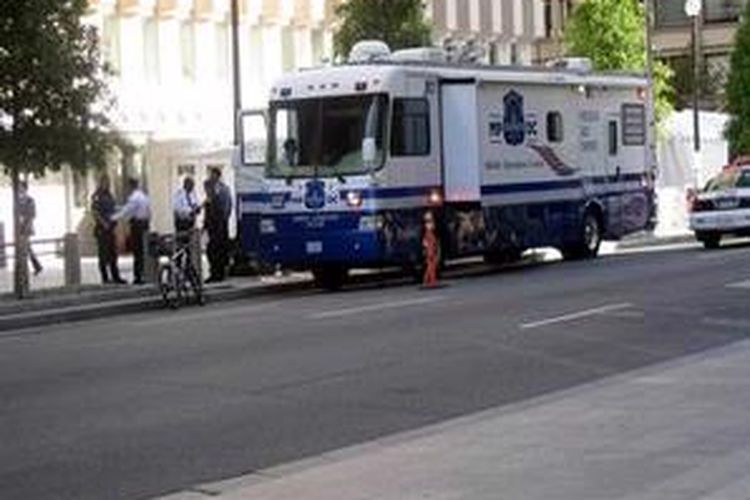 Selama diselenggarakan pertemuan tahunan Bank Dunia-Dana Moneter Internasional (IMF) tanggal 10-13 Oktober 2008 di Washington DC, Amerika, jalan-jalan di sekitar Gedung IMF dan Bank Dunia ditutup dan dijaga ketat petugas keamanan.(KOMPAS/TJAHJA GUNAWAN DIREDJA)