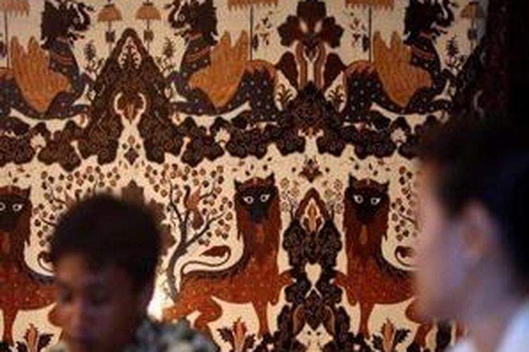 Salah satu motif asli batik Keraton Kanoman Cirebon, Paksi Naga Liman, dipajang pada Peluncuran Pusat Pelatihan Batik Keraton Kanoman Cirebon di Keraton Kanoman Cirebon, Jumat (17/10) malam. (KOMPAS.COM/KRISTIANTO PURNOMO)