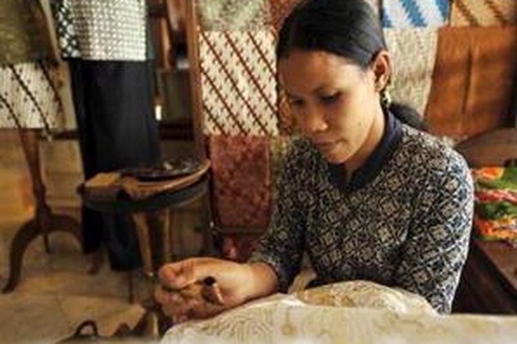 Pembatik memeragakan cara membantik di lobi Hotel Lo In Surakarta, Jawa Tengah, Jumat (24/10). Batik, Keris, wayang, dan gamelan akan menjadi materi workshop untuk mendukung Konferensi dan Ekspo Kota-kota Pusaka Dunia yang berlansung 25-28 Oktober ini.(KOMPAS/HERU SRI KUMORO)