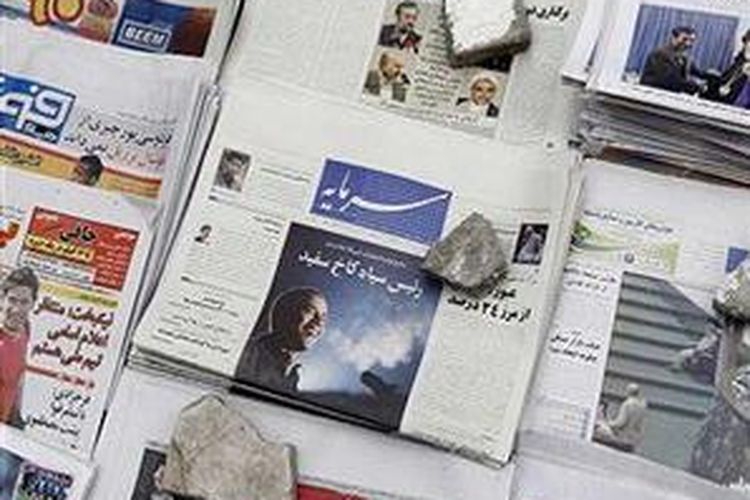 Gambar Barack Obama terlihat di halaman muka sebuah harian reformis Iran Sarmayeh dengan judul "Pemimpin Kulit Hitam di Gedung Putih." Harian tersebut dijajakan oleh penjualan koran di Teheran, 5 November 2008.
