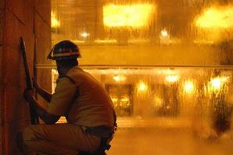 Seorang polisi mengintai hotel Taj Mahal yang sedang diserang gerombolan bersenjata