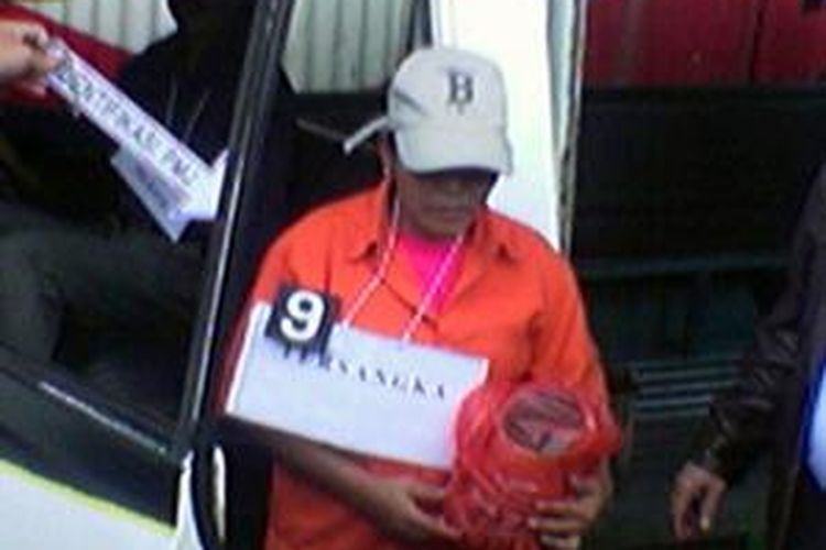 Tersangka kasus mutilasi, Sriyati melakukan rekonstruksi penyebaran mayat di halaman Polda Metro Jaya, Rabu (3/12).