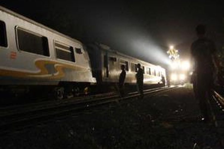 KA Argo Jati jurusan Cirebon-Jakarta anjlok di Desa Jatirasa, Kecamatan Patokbeusi, Subang, Jawa Barat, Rabu sekitar pukul 15.30. Hingga pukul 21.30 KA itu belum bisa dievakuasi.(KOMPAS/MUKHAMAD KURNIAWAN)