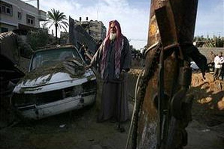 Seorang pria mengamati mobil yang rusak akibat serangan Israel.(GETTY IMAGES/Abid Katib)
