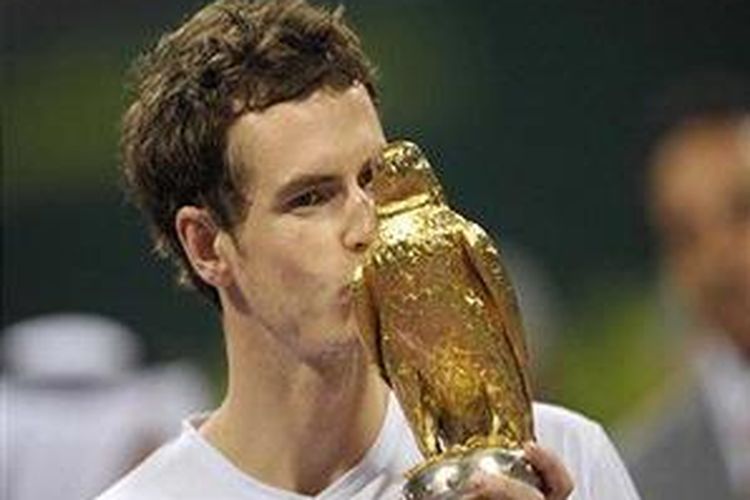 Andy Murray mengecup trofi Qatar Terbuka 2009 yang diraih usai menaklukkan Andy Roddick.(GETTY IMAGES)