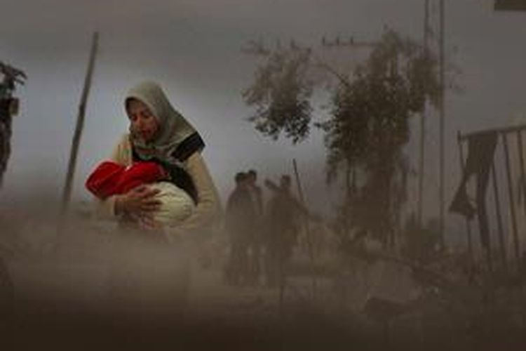 Seorang wanita menggendong bayinya di kawasan perumahan yang hancur di pinggiran Kota Gaza, 23 Januari 2009. Penduduk Gaza masih kekurangan pangan dan air bersih akibat serangan Israel.