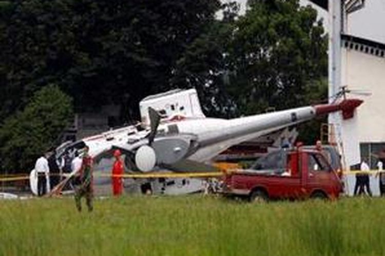 Helikopter Super Puma milik maskapai penerbangan Pelita Air mengalami kecelakaan saat melakukan grounded test di hanggar Lapangan Terbang Pondok Cabe, Tangerang, Banten, Kamis (29/1). Akibat kecelakaan ini dua orang teknisi maskapai penerbangan tersebut meninggal dunia.(KOMPAS.COM/KRISTIANTO PURNOMO)