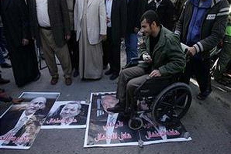 Warga Palestina menginjak poster politisi Israel - Ehud Olmert, Ehud Barak, Shimon Peres dan Tzipi Livni - dalam sebuah unjuk rasa menentang operasi militer Israel di luar gedung parlemen di Kota Gaza, 30 Januari 2009