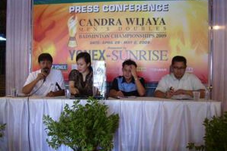 Panitia turnamen "Candra Wijaya Men's Double Turnamen", yaitu (ki-ka) Broto Happy, Rosiana Tendean, Candra Wijaya, dan Hadi Nazri dalam konferensi pers di Jakarta, Rabu (15/4).