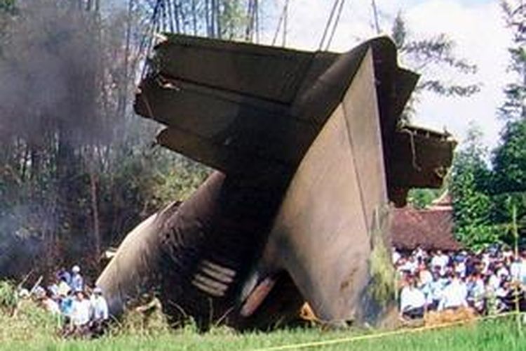 Anggota TNI mengevakuasi korban jatuhnya pesawat Hercules TNI AU di Desa Geplak, Karas, Magetan, Jawa Timur, Rabu (20/5).(AFP/NAUFAL)