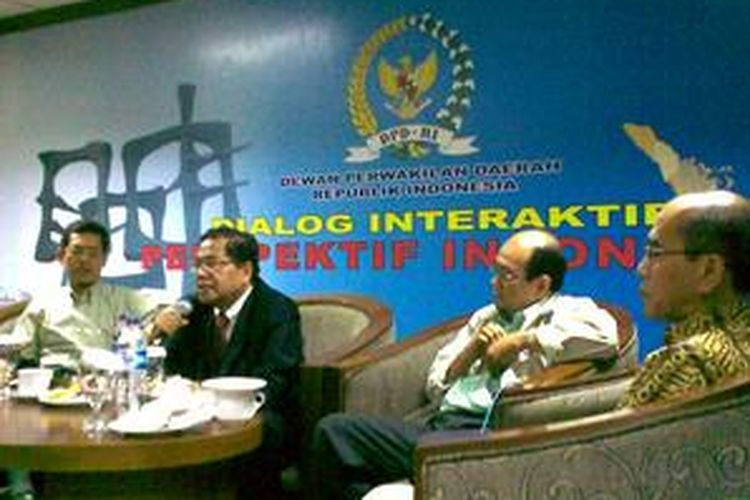 Anggota DPD Marwan Batubara, mantan Menko Perekonomian Rozal Ramli, anggota DPR RI Harry Azhar Azis dan ekonom Faisal Basri dalam diskusi bertajuk "Ekonomi Neoliberal vs Kerakyatan' di Gedung DPD RI, Jumat (29/5).