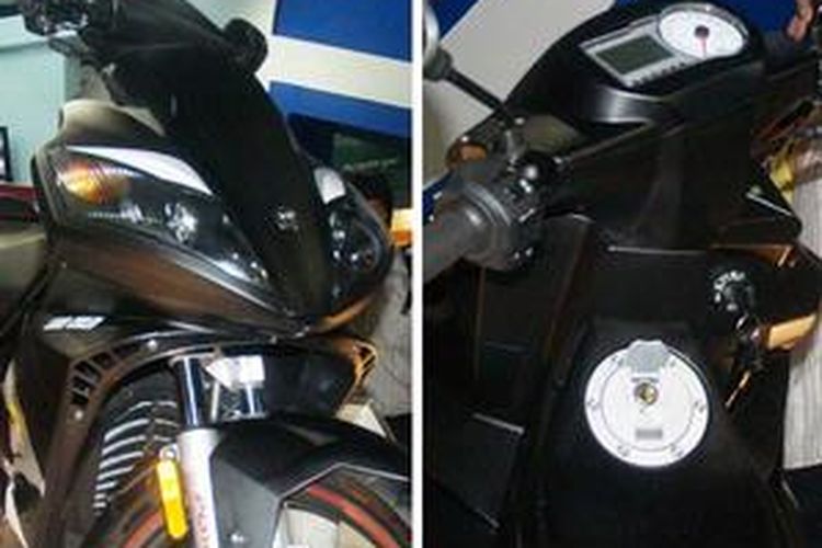 Wajah GTR150 dengan lampu utama dan sein depan disatukan 9kiri), speedometer digital dan tutup tangki bensin di depan (kanan).(Kompas.com/Zulkifli BJ)