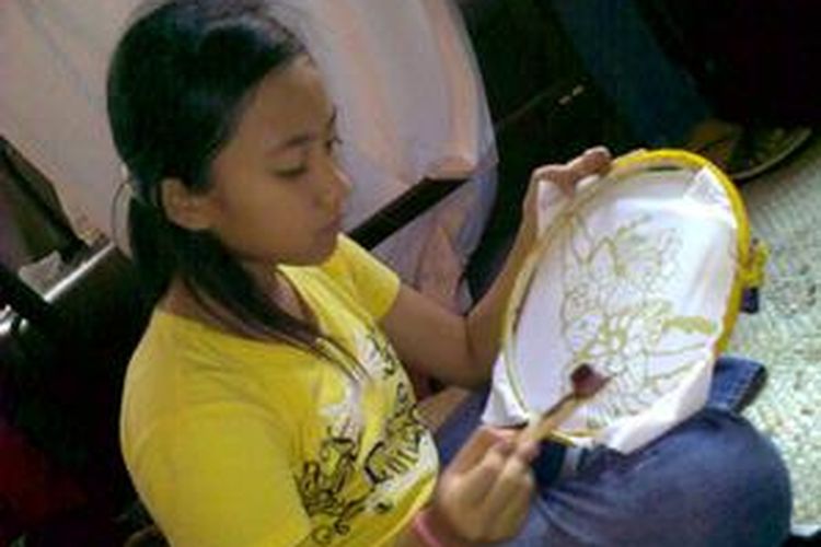 Salah satu pengunjung Batavia Art Festival 2009 sedang mencoba membatik, dalam salah satu workshop yang diselenggarakan oleh Meseum Tekstil Minggu (21/6).