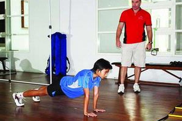 Rhidatia Eka Putri, peserta audisi beasiswa bulu tangkis Djarum, menjalani tes fisik awal bersama pelatih fisik Jason Kurfurst (kanan), Sabtu (4/7). (Kompas/J Waskita Utama)
