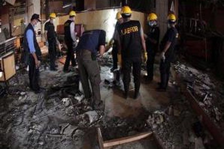 Petugas Pusat Laboratorium Forensik Mabes Polri melakukan olah TKP di titik ledakan bom di Hotel Ritz-Carlton, Jakarta Selatan, Sabtu (18/7).(RUMGAPRES/ABROR RIZKY)