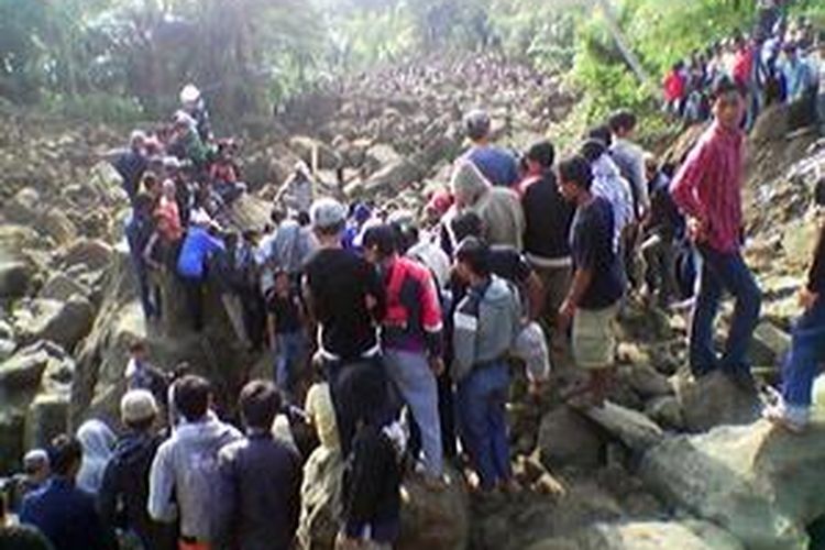 Proses evakuasi korban yang tertimbun longsor paska gempa di Desa Cicangkareng, Kecamatan Cibinong, Kabupaten Cianjur, Kamis (3/9). Evakuasi sulit dilakukan karena material longsoran berupa batu-batuan.(KOMPAS/ AGUSTINUS HANDOKO)