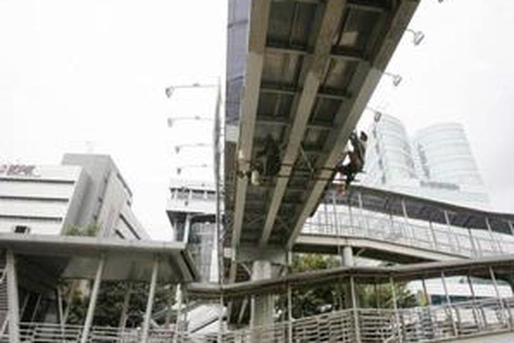 Dua orang pekerja mengecat jembatan penyeberangan orang (JPO) di Jalan HR. Rasuna Said, Jakarta Selatan, Selasa (6/10). Pengecatan tersebut merupakan upaya menjaga kebersihan dan keindahan JPO yang berada di kawasan perkantoran.