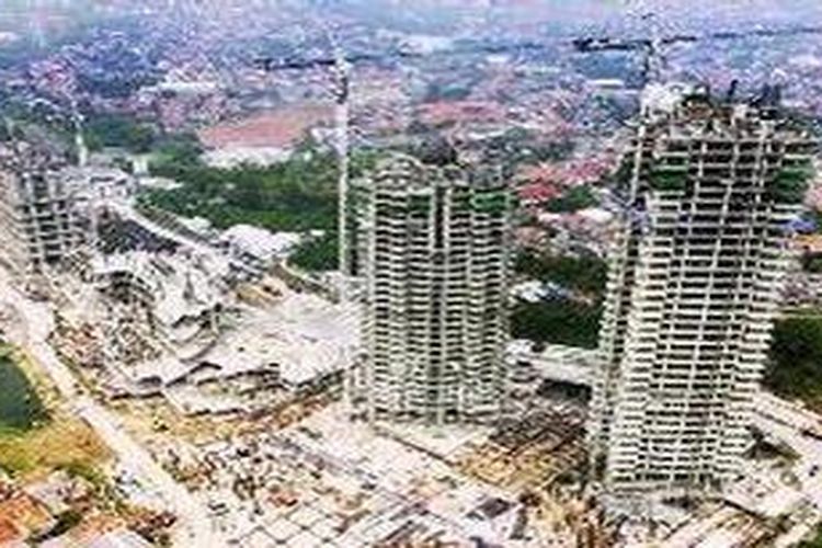 Pengerjaan proyek superblok Kemang Village, Jakarta, yang memadukan apartemen, sekolah, mal, dan rumah sakit dilihat dari udara, Kamis (27/8). Proyek berkonsep kawasan terpadu senilai 1,1 juta dollar AS tersebut selain untuk segmen papan atas domestik juga dipersiapkan untuk dibukanya kesempatan kepemilikan asing serta asumsi lonjakan properti pada 2010.(KOMPAS/RIZA FATHONI)