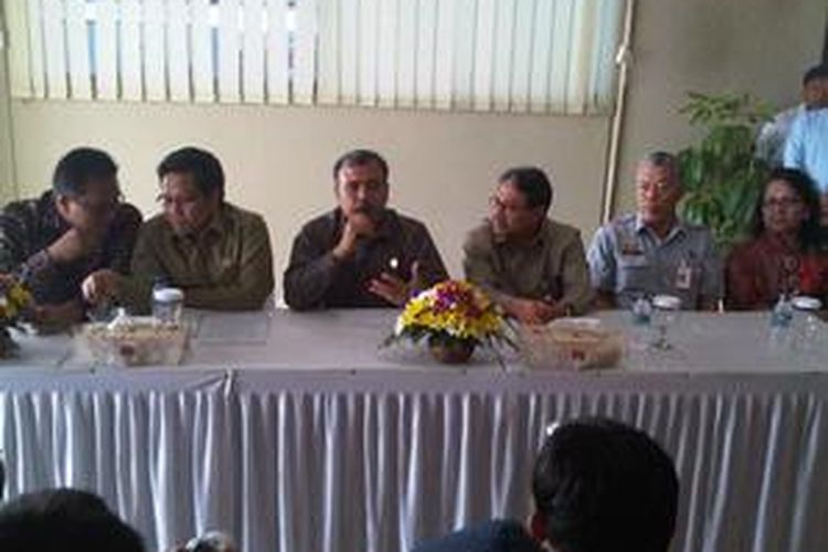 Kepala BNP2TKI Mohammad Jumhur Hidayat, Menteri Tenaga Kerja dan Transmigrasi Muhaimin Iskandar, Menteri Hukum dan Hak Asasi Manusia Patrialis Akbar, Wakil Menteri Luar Negeri Triyono Wibowo, Direktur Jenderal Perhubungan Udara Dephub Henry Bakti, dan perwakilan Menko Kesra Maswati melayani pertanyaan wartawan di Ruang Tunggu Khusus TKI di Bandara Soekarno-Hatta, Tangerang, Selasa (10/11). Mereka menyambut 416 WNI bermasalah asal Kuwait dan Jeddah yang dijemput dengan pesawat khusus dari Garuda Indonesia.(Hamzirwan/Harian KOMPAS)