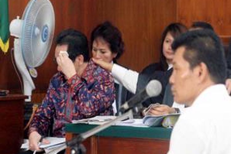 Terdakwa kasus pembunuhan Nasrudin Zulkarnaen, Wiliardi Wizar (kanan) saat memberikan pengakuan mengejutkan dalam sidang dengan terdakwa Antasari Azhar (kiri) hingga menangis di Pengadilan Negeri Jakarta Selatan, Jalan Ampera, Jakarta, Selasa (10/11).(PERSDA NETWORK/BIAN HARNANSA)
