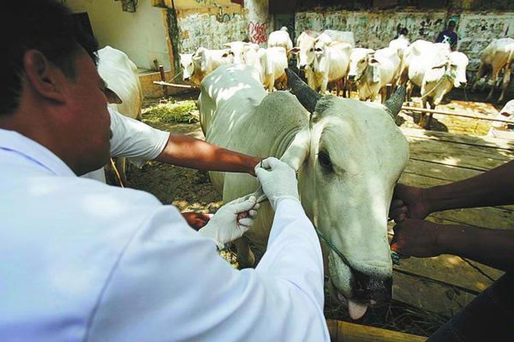 Ilustrasi: Petugas pemeriksa kesehatan hewan dan daging sedang memeriksa kesehatan sapi. (KOMPAS/AGUS SUSANTO)