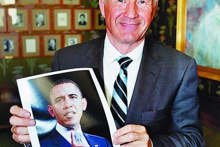 Ketua Komite Nobel Norwegia Thorbjorn Jagland memegang foto Presiden AS Barack Obama di Oslo, Norwegia, Jumat (9/10), seusai pengumuman Obama sebagai peraih Nobel Perdamaian 2009.