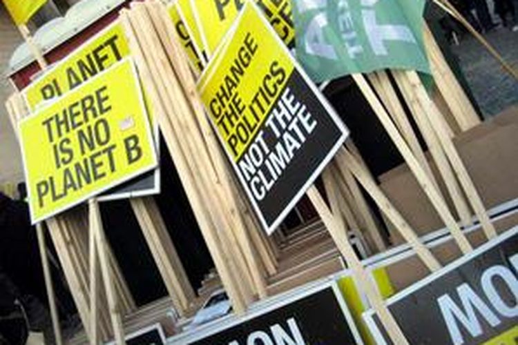 Tumpukan spanduk dan plakat yang dipakai dalam aksi