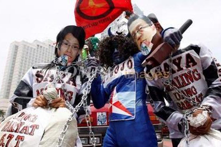 Aksi teatrikal digelar para pengunjuk rasa di Bundaran Hotel Indonesia, Jakarta, Rabu (3/2/2010). Mereka menuntut penuntasan kasus skandal Bank Century. KOMPAS IMAGES/KRISTIANTO PURNOMO(KRISTIANTO PURNOMO)