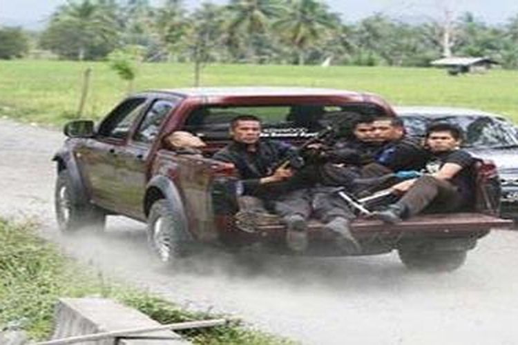 Sebuah mobil menggangkut anggota polisi yang diduga tertembak saat operasi pengepungan kelompok radikal di pegunungan Lembah Seulawah,, Kamis (4/3).