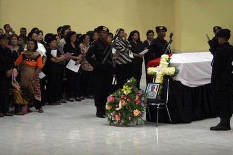 Jenazah Briptu (Pol) Boas Woisiri, saat akan disemayamkan di Aula Soemarto, Di Markas Komando Brigade Mobil Mako Brimob, Kelapa Dua, Depok, Sabtu (6/3) malam.