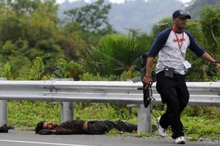 Seorang teroris terkapar tewas tertembak dalam baku tembak dengan aparat kepolisian di Desa Leupung, Aceh Besar, Jumat (12/3/2010).(SERAMBI INDONESIA/M ANSHAR)