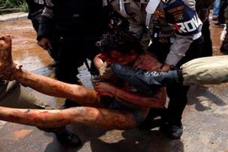 Seorang bocah ditendang aparat saat bentrok antara warga dengan Satpol PP yang berupaya membongkar kompleks makam Mbah Priuk di Koja, Jakarta Utara, Rabu (14/4/2010). Bentrokan ini mengakibatkan sedikitnya 100 orang terluka dan belasan kendaraan roda dua dan empat dibakar massa.(KOMPAS IMAGES/KRISTIANTO PURNOMO)