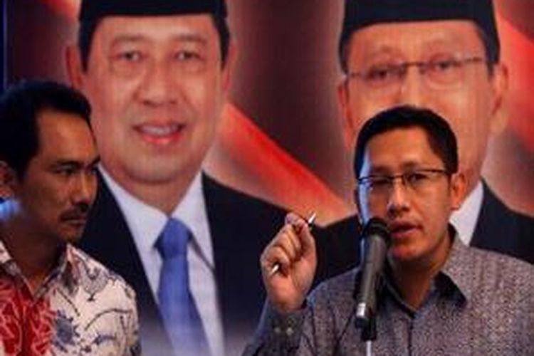 Ketua Dewan Pimpinan Pusat Partai Demokrat, Anas Urbaningrum (kanan) dan juru bicara tim sukses SBY-Boediono, Rizal Mallarangeng saat jumpa pers di Bravo Media Center, Jumat (29/5). Jumpa pers ini membahas mengenai penolakan kubu SBY-Boediono terhadap politisasi agama dalam pelaksanaan Pilpres 2009.(KOMPAS IMAGES/KRISTIANTO PURNOMO)