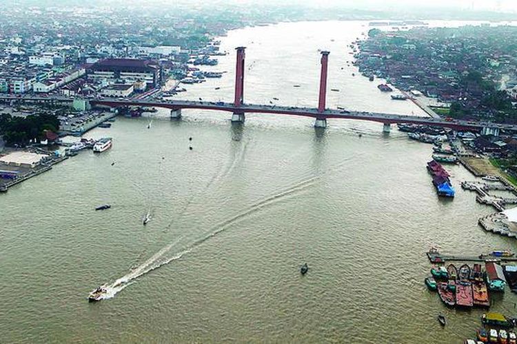 Jembatan Ampera yang membentang di atas Sungai Musi, yang menjadi ikon kota Palembang, Minggu (14/3), merupakan sarana penghubung antara kawasan seberang Ulu dengan Ilir.