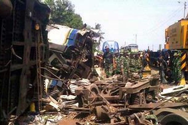 Gerbong KA Senja Utama yang hancur akibat ditabrak KA Argo Bromo Anggrek, di Petarukan, Pemalang, Jawa Tengah, Sabtu (2/10/2010).