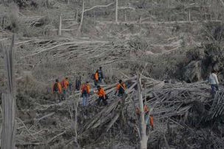 Relawan dan tim SAR terus berupaya menemukan korban di antara reruntuhan dan debu vulkanik yang dimuntahkan Gunung Merapi, di Pakem, Selaman, Rabu (26/10/2010).