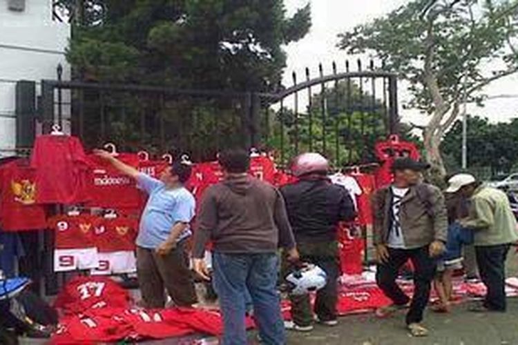Suasana pasar kaget yang menjual berbagai atribut Timnas di Kompleks Stadion Gelora Bung Karno, Jakarta Selatan, Sabtu (25/12/2010).