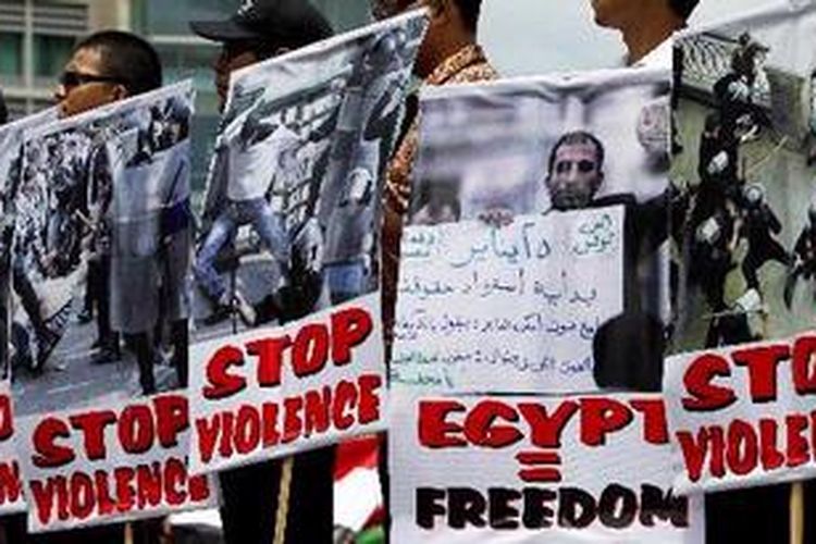 Masyarakat Dunia Untuk Demokrasi dan Hak Asasi Manusia menggelar aksi di Kawasan Bundaran Hotel Indonesia, Jakarta, Senin (31/1/2011). Mereka mengutuk tindakan represif aparat keamanan saat mengamankan demonstrasi rakyat Mesir.(KOMPAS IMAGES/DHONI SETIAWAN)