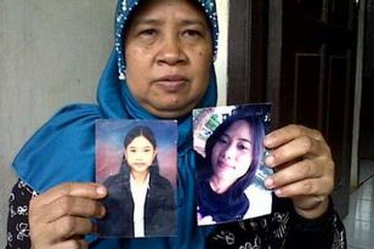 Ibu mertua korban, Munawaroh (49) saat menunjukan foto TKW yang jatuh dari apartemen lantai 18 ditempatnya bekerja di Singapore. (C11-11)