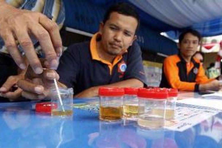 Ilustrasi : Petugas Badan Narkotika Provinsi DKI Jakarta (BNP DKI) tengah menguji sampel urine yang diambil dari seorang pengemudi bus di Terminal Lebak Bulus, Jakarta Selatan, Sabtu (4/9/2010). (KOMPAS IMAGES/DHONI SETIAWAN )