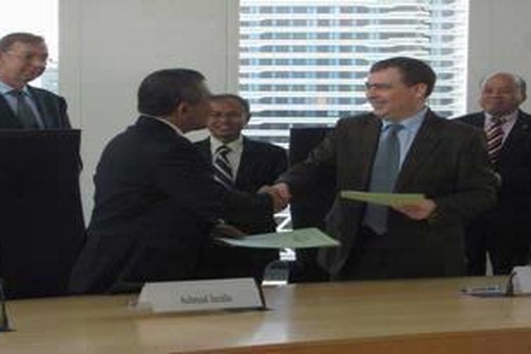 Penandatangan kerjasama beasiswa oleh Direktur Nuffic Neso Indonesia, Marrik Bellen, dan Direktur Kelembagaan dan Kerjasama Dikti Kemdiknas, Achmad Jazidie, Senin (19/9/2011), di Den Haag, Belanda.