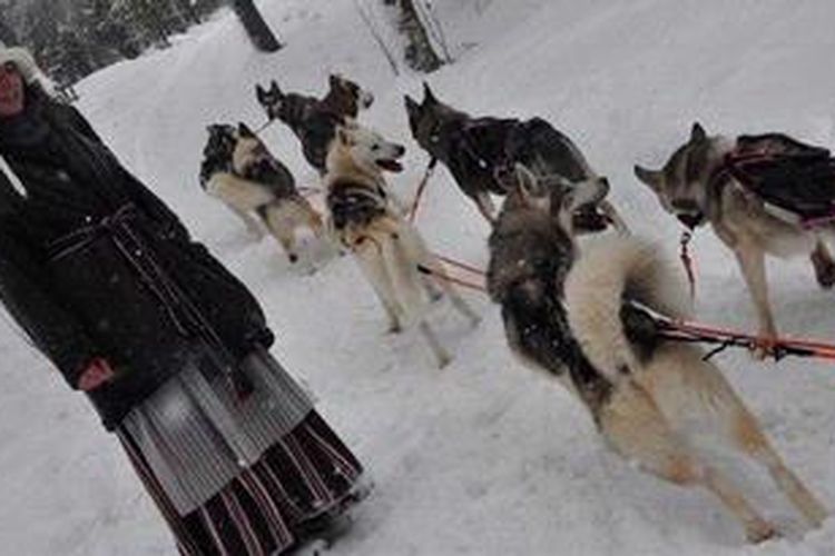 Seorang perempuan menggunakan busana tradisional Sami. Ia merupakan penjaga Siberian Huskies.